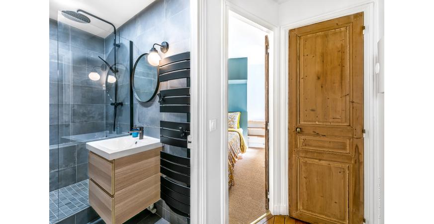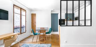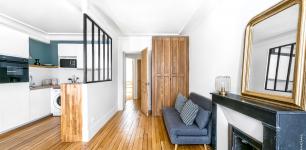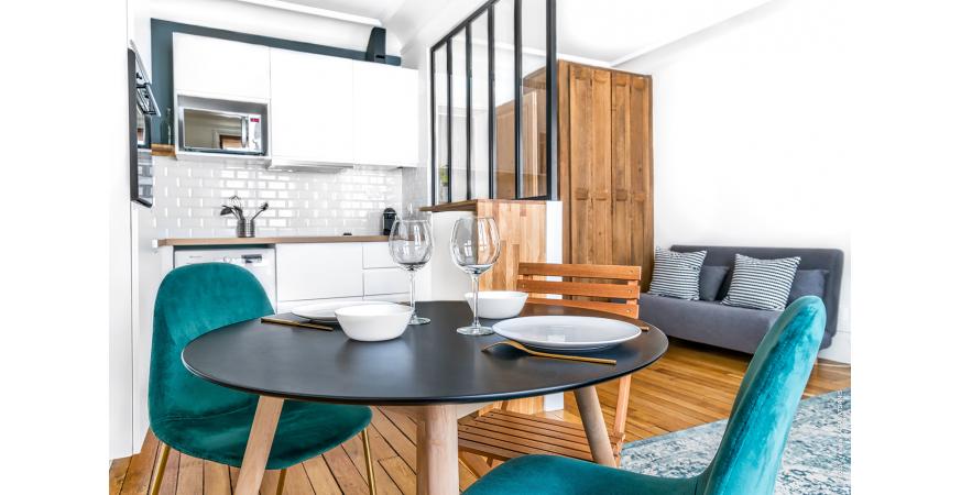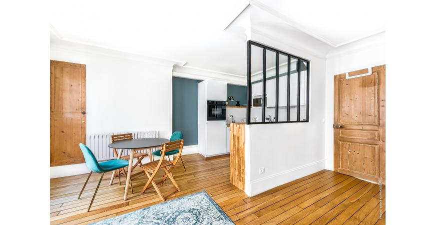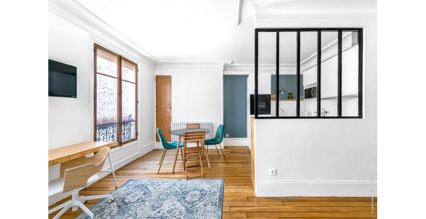 L’appartement se compose d’un séjour lumineux et calme donnant sur une cour intérieure, d’une cuisine ouverte entièrement équipée, d’une chambre confortable et d’une salle d’eau avec WC.