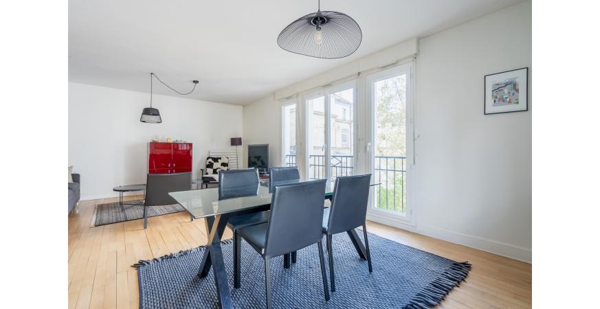 L'appartement meublé. Il offre donc 2 chambres, 2 salles de bain, 3 wc, 1 cuisine, un salon/salle a manger. Charme du moderne dans l'immeuble ancien.