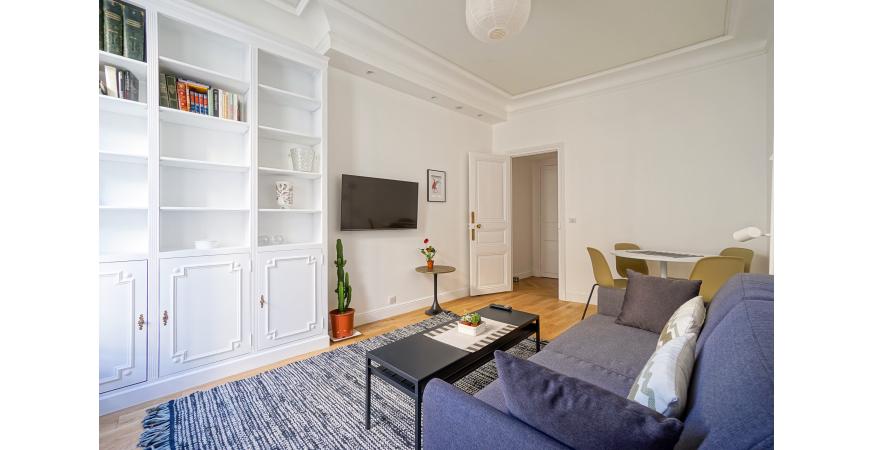 L'appartement est refait à neuf par un architecte. Il offre un salon, une cuisine équipée, une chambre et une salle d’eau avec toilette séparé. Charme de l'ancien : parquet, moulures, cheminée.