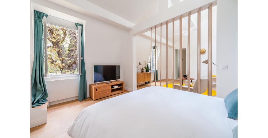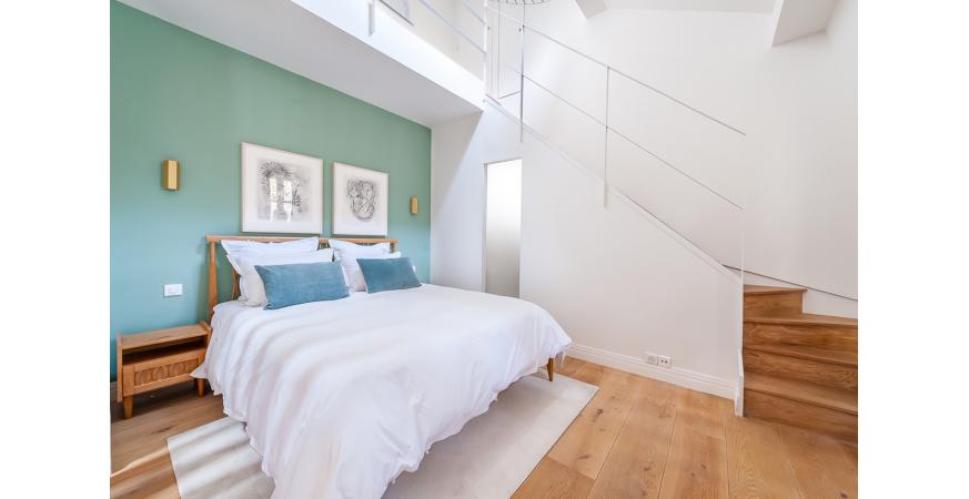 Au 1er niveau : un grand salon, cuisine séparée, un espace chambre de Maitre séparé par un paravent, à l’étage une 2ème chambre et une buanderie. Grande hauteur sous plafond, toutes les fenêtres de l’appartement donnent sur le jardin intérieur (bois Visconti), calme absolu, décoration raffinée.