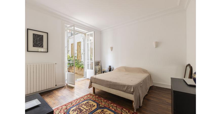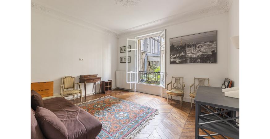VUE TOUR EIFFEL Comme une maison : situé rue de l'Université, à quelques pas de la Tour Eiffel et des Quais de Seine cet appartement typiquement parisien offre 60 m2 (surface Carrez) avec une très grande terrasse plein pied de 34m2. Il est situé au rez-de-jardin d’un très bel immeuble de 1880. Il comprend un séjour, une cuisine équipée séparée, 1 chambre (possibilité de 2 chambres), une salle de bain (possibilité de créer une 2ème salle de douche et WC), 1 WC. Exposition Est et Ouest. Traversant. Calme absolu. Chauffage au gaz individuelle. Gardienne dans l’immeuble