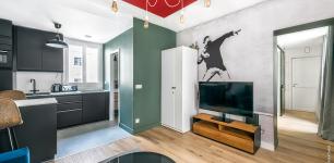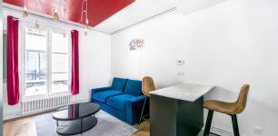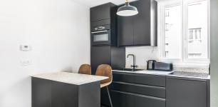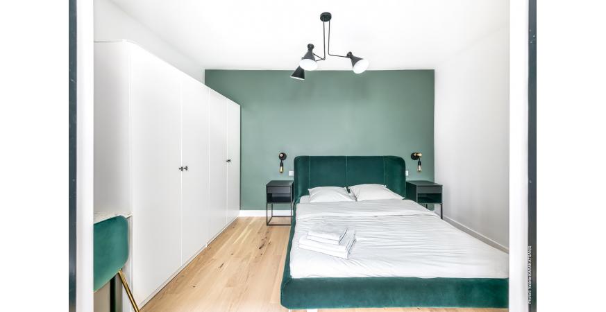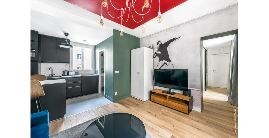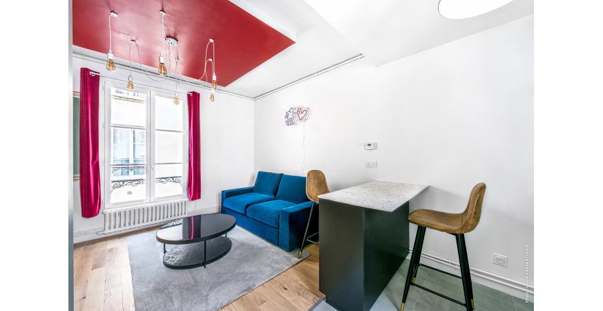 L’appartement se compose d’un séjour lumineux donnant sur une cour intérieure paisible, d’une cuisine ouverte entièrement équipée, d’une chambre confortable et d’une salle de douche avec WC.