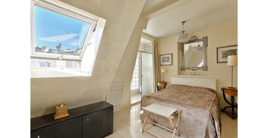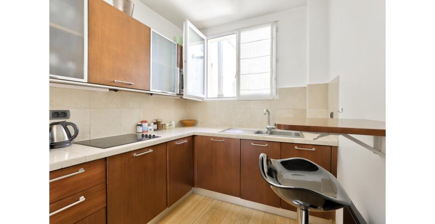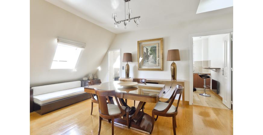 L’appartement offre une vue dégagée sur les toits de Paris et se compose d’une entrée, d’un séjour avec salle à manger, d’une cuisine équipée indépendante, d’une chambre, d’une salle de douche et de toilettes.