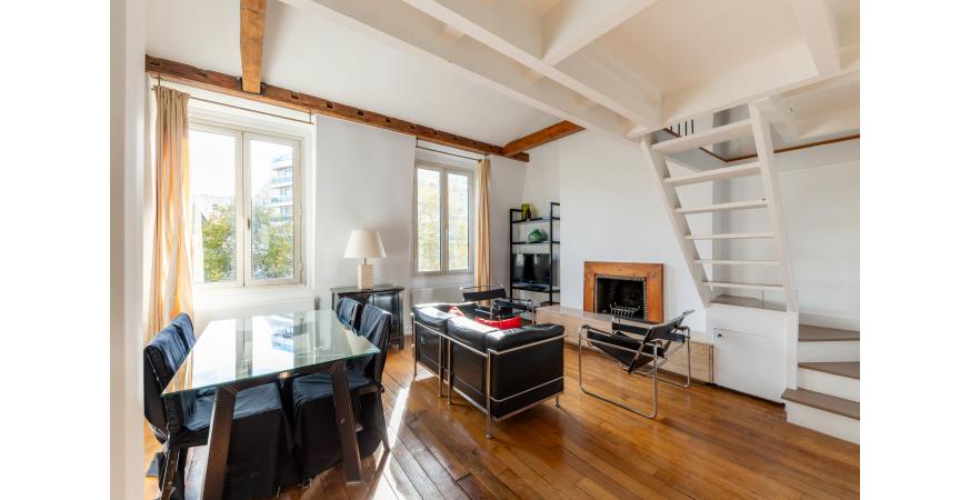 EXCLUSIVITE Situé sur une très belle avenue du 7ème arrondissement au 4ème étage (avec un ascenseur) d’un joli immeuble ancien. Un charmant appartement de 49,15m2 (Loi Carrez) et 65,55m2 au sol composé d’un grand salon donnant sur l'avenue, d’une chambre avec une vue sur les toits de Paris et la Tour Eiffel, d’une salle de douche avec un WC et d’une cuisine, d'un mezzanine pouvant servir d'une 2ème chambre ou d'un bureau. Charme de l'ancien, parquet, cheminée, poutres apparentes, grande hauteur sous le plafond.