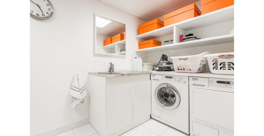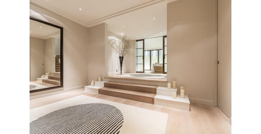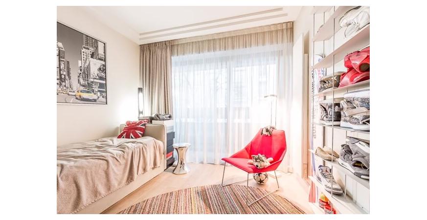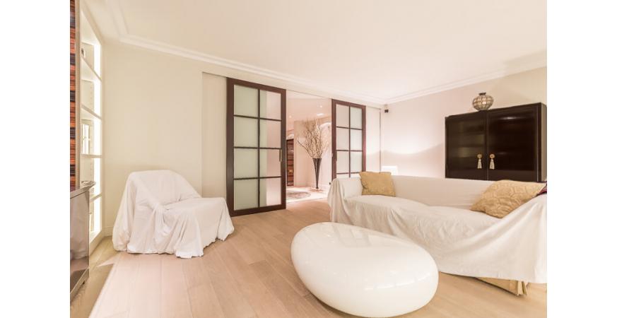 Au rdc de l'appartement, il y a un hall d'entrée (de 30 m2) avec la grande salle de télévision, des toilettes invités et un dressing.