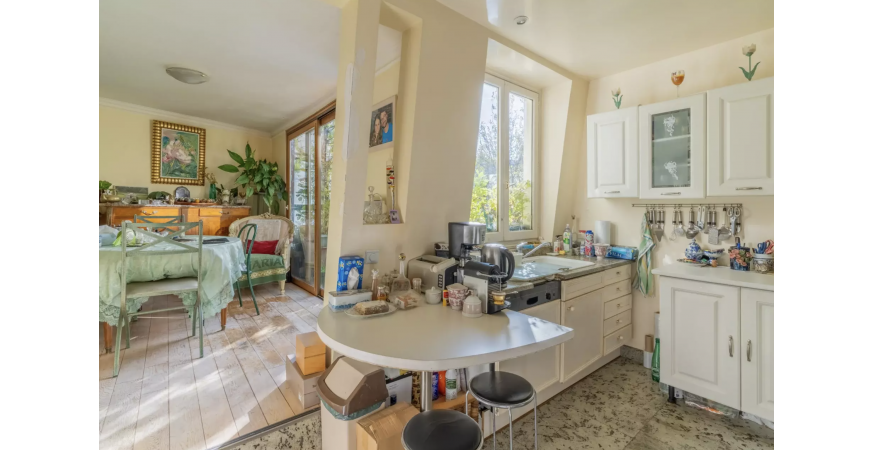 Au 2ème niveau : un grand salon décoré du style Art Nouveau avec deux cheminées, grand hauteur sous plafond, moulures de l'époque, placards ; un salon ouvert avec une salle à manger avec cuisine équipée et cuisine dînatoire tous les deux donnant sur une grande et belle terrasse équipée (31m2), exposée plein Sud, vue sur la Tour Eiffel.