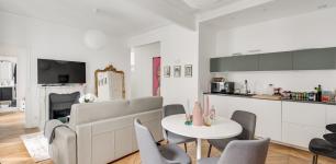 is located on the 3rd floor (by staircase) of a very beautiful building from 1860 with a caretaker. It includes a living room with an open fitted kitchen, a bedroom with a large closet, a shower room and a separate toilet.