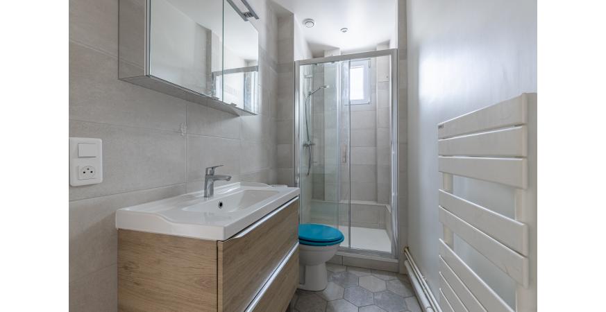 A charming duplex of 76m2 (Carrez Law) and 119m2 of total area composed on the first level: a large living room with a fireplace, a bedroom, a shower room with a WC and a kitchen.
