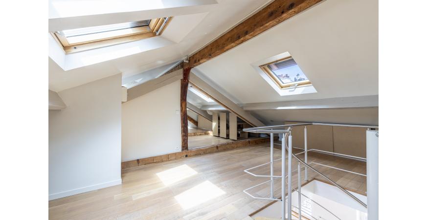Upstairs: a large living space with exposed beams and 7 skylights, a sleeping area (2nd bedroom), an study area, a bathroom and a WC. A cellar.