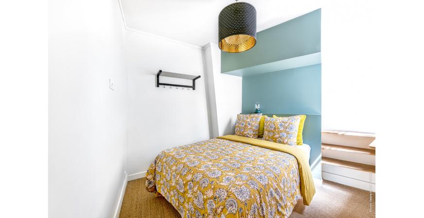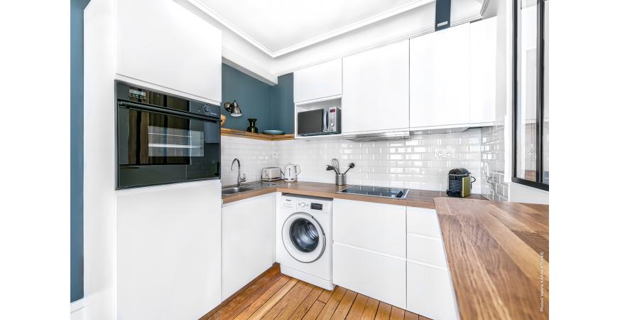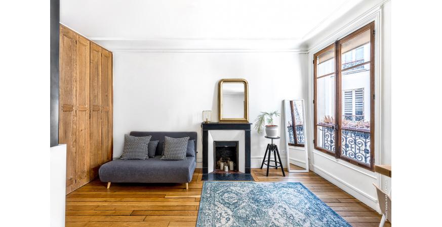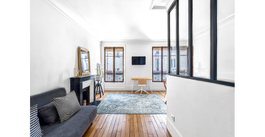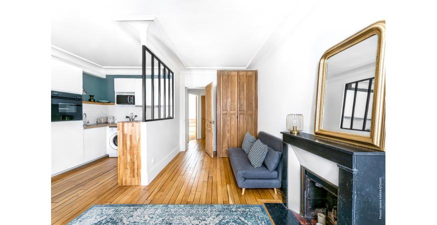 L’appartement se compose d’un séjour lumineux et calme donnant sur une cour intérieure, d’une cuisine ouverte entièrement équipée, d’une chambre confortable et d’une salle d’eau avec WC.