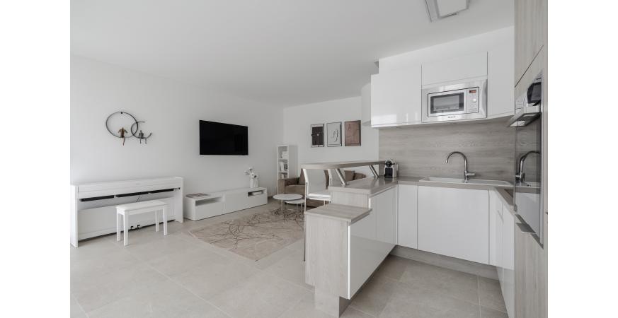 Une pièce principale avec salon et salle à manger, ainsi qu'une cuisine entièrement équipée qui s'ouvre sur la terrasse.