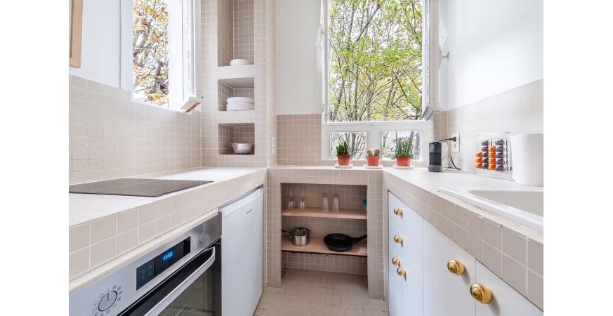 Au 1er niveau : un grand salon, cuisine séparée, un espace chambre de Maitre séparé par un paravent, à l’étage une 2ème chambre et une buanderie. Grande hauteur sous plafond, toutes les fenêtres de l’appartement donnent sur le jardin intérieur (bois Visconti), calme absolu, décoration raffinée.
