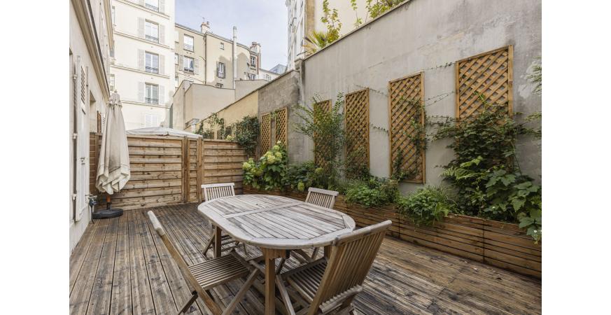 VUE TOUR EIFFEL Comme une maison : situé rue de l'Université, à quelques pas de la Tour Eiffel et des Quais de Seine cet appartement typiquement parisien offre 60 m2 (surface Carrez) avec une très grande terrasse plein pied de 34m2. Il est situé au rez-de-jardin d’un très bel immeuble de 1880. Il comprend un séjour, une cuisine équipée séparée, 1 chambre (possibilité de 2 chambres), une salle de bain (possibilité de créer une 2ème salle de douche et WC), 1 WC. Exposition Est et Ouest. Traversant. Calme absolu. Chauffage au gaz individuelle. Gardienne dans l’immeuble