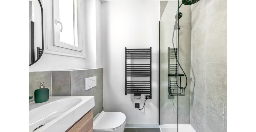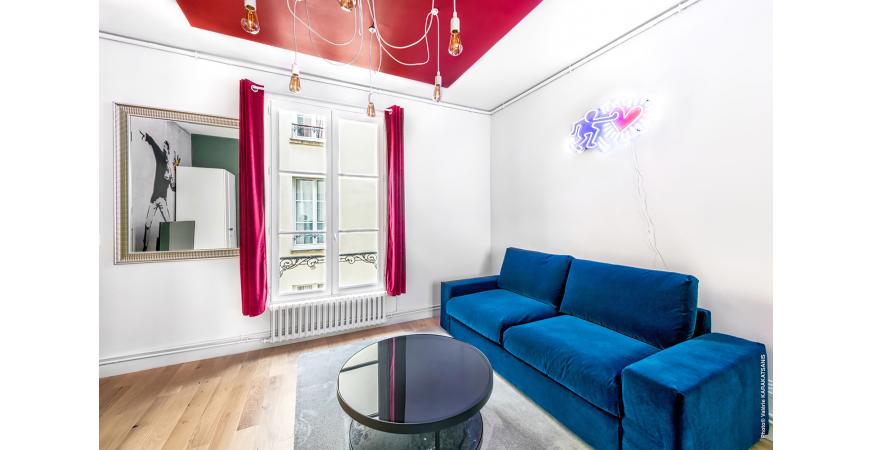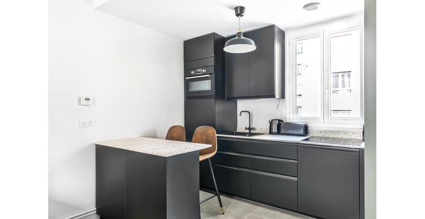 L’appartement se compose d’un séjour lumineux donnant sur une cour intérieure paisible, d’une cuisine ouverte entièrement équipée, d’une chambre confortable et d’une salle de douche avec WC.