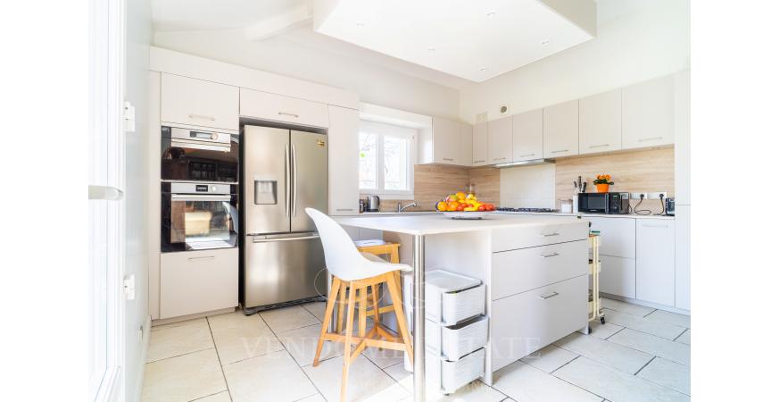 - Un spacieux séjour (environ 50m2) avec plafond en cathédrale, baignée du soleil exposé Sud-Est avec sa cuisine dinatoire équipée dinatoire