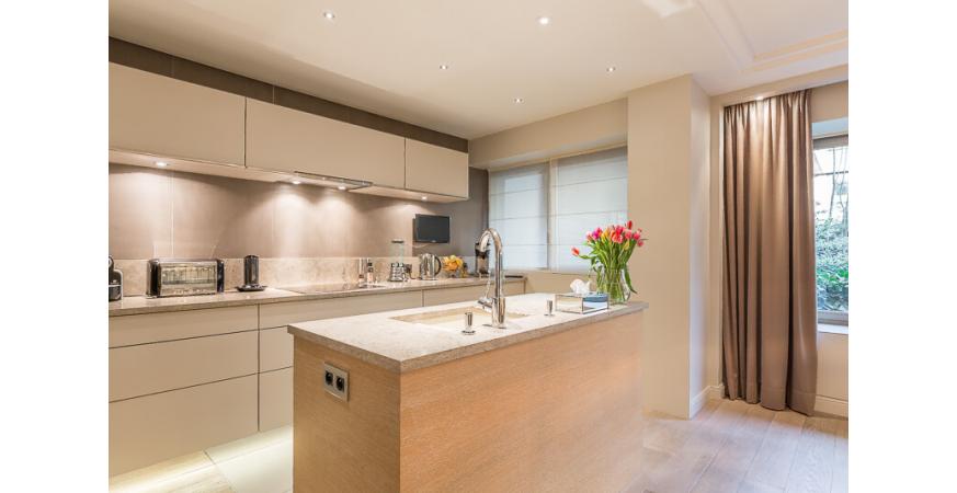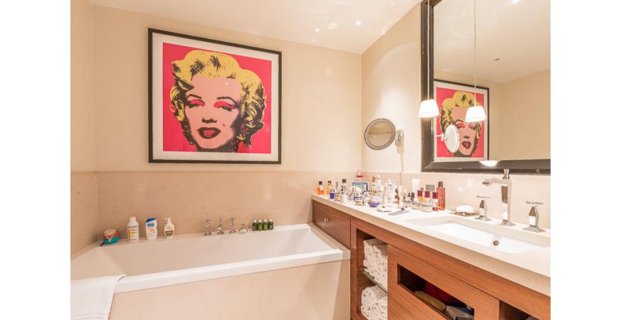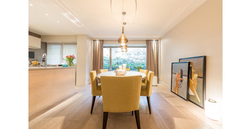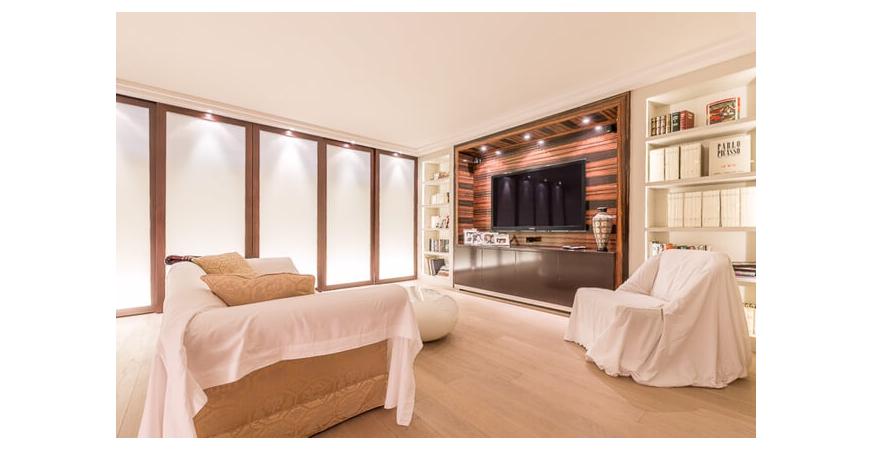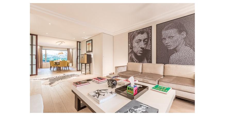 Au rdc de l'appartement, il y a un hall d'entrée (de 30 m2) avec la grande salle de télévision, des toilettes invités et un dressing.