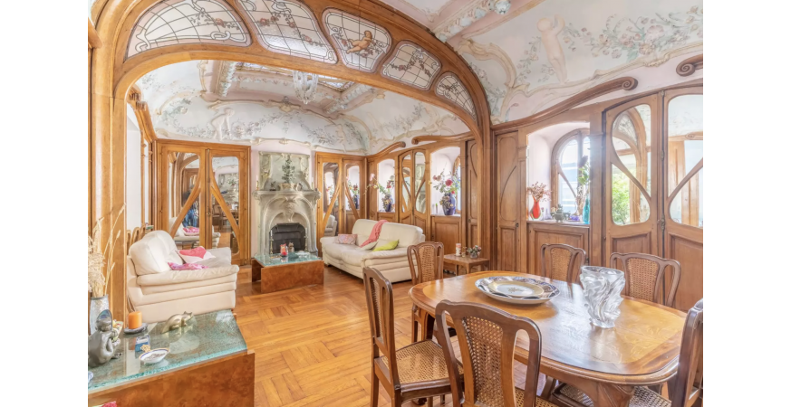Au 2ème niveau : un grand salon décoré du style Art Nouveau avec deux cheminées, grand hauteur sous plafond, moulures de l'époque, placards ; un salon ouvert avec une salle à manger avec cuisine équipée et cuisine dînatoire tous les deux donnant sur une grande et belle terrasse équipée (31m2), exposée plein Sud, vue sur la Tour Eiffel.