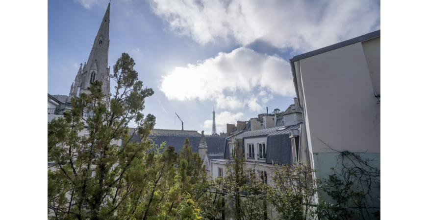Triangle d'or, dans un très bel hôtel particulier historique de 1880 un appartement sur 3 niveaux au charme de l’ancien avec 2 terrasses paysagées avec vue sur la Tour Eiffel. Il offre 205M2 (loi Carrez) et de 285M2 de surface totale.