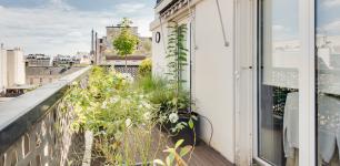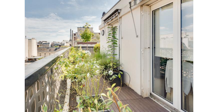 Вся квартира окружена просторной террасой площадью 50 м² и 3 балконами, с которых открывается потрясающий вид на крыши Парижа и Эйфелеву башню. Очень тихо, без прямого соседства, сквозное расположение, солнечно.